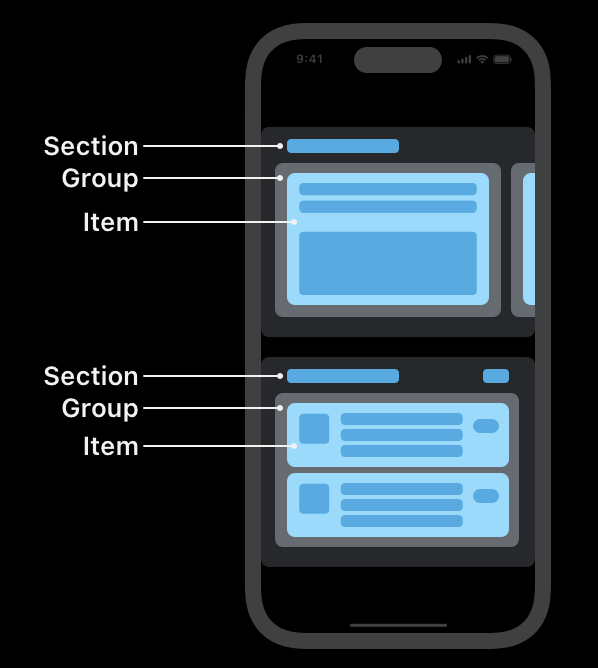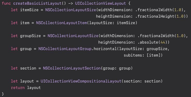- NSCollectionLayoutSection 객체를 사용하여 섹션 단위로 레이아웃을 정의